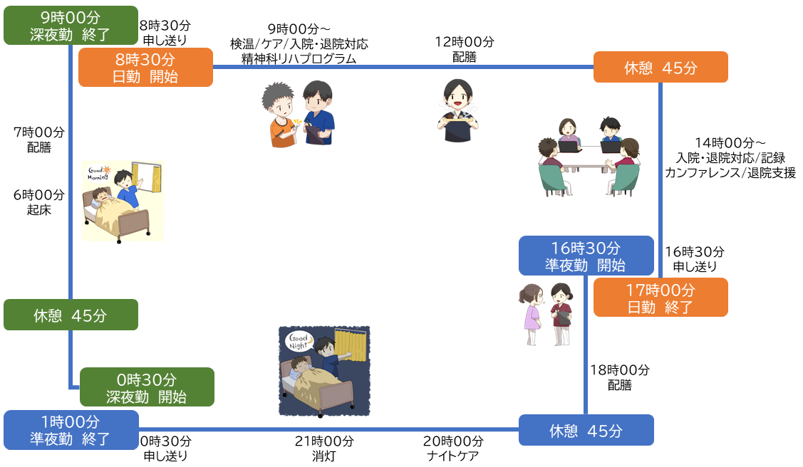 時間外勤務を抑えワークライフバランスを大切にできるよう、早出遅出の勤務を導入している部署もあります
